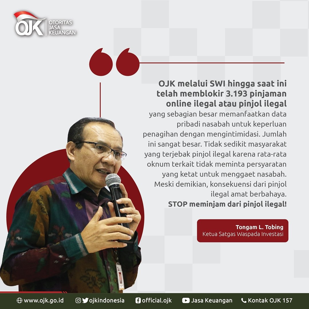 "Meski demikian, konsekuensi dari pinjaman online ilegal amat berbahaya. Stop meminjam dari pinjol ilegal!" tegas Ketua SWI Tongam L, Tobing dikutip dari laman OJK, Selasa, 22 Juni 2021.